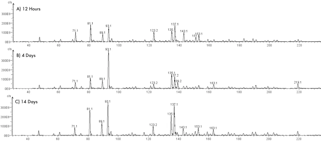 圖2:(A) 發(fā)酵開始的12小時,(B) 4天,以及 (C) 14天獲取的質(zhì)譜圖