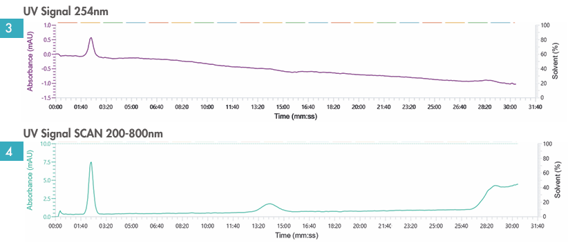 圖3與圖4:紫外檢測下化合物不可見。檢測初期首波化合物開始顯現低強度信號,但強度不足以實現有效收集